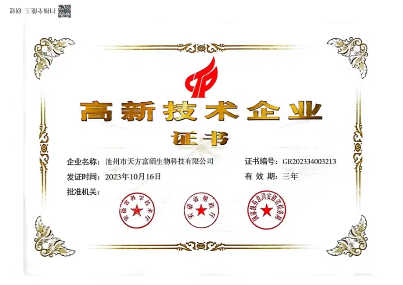 近日,池州市天方富硒生物科技有限公司正式通過高新技術企業(yè)認定,榮獲由安徽省科學技術廳、安徽省財政廳、國家稅務總局、安徽...